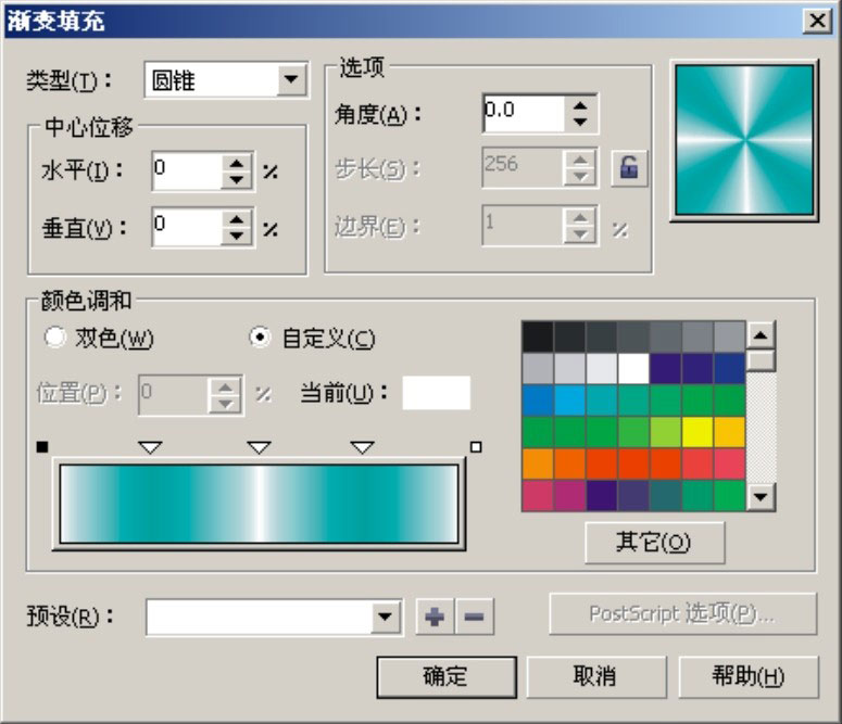 13 确定复制的图形处于被选择状态,在状态栏上双击“填充”显示窗,打开“渐变填充”对话框。在“类型”下拉选项栏中选择“圆锥”选项,在“颜色调和”选项组中选择“自定义”单选按钮,设置渐变颜色为由白色、绿色(C:69、M:0、Y:40、K:0)、白色、绿色(C:69、M:0、Y:40、K:0)和白色组成,其他参数使用默认设置,如图2-11所示。