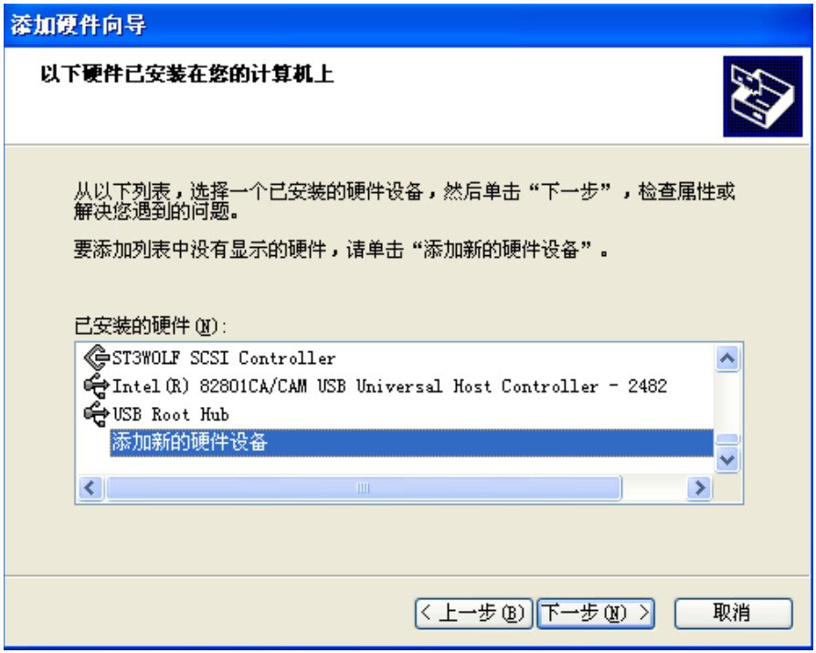 (2)单击选中“添加新的硬件设备”选项,然后单击“下一步”按钮,如图2.19所示。