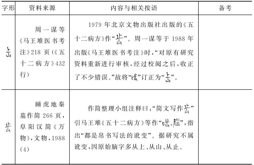 ”。这些“脑”字,都是距今2200年前的原文,没有受到后人的修饰,代表了“脑”字创立早期字形。它们都强调从上、从匕、从山、从止。笔者认为,这些“脑”字