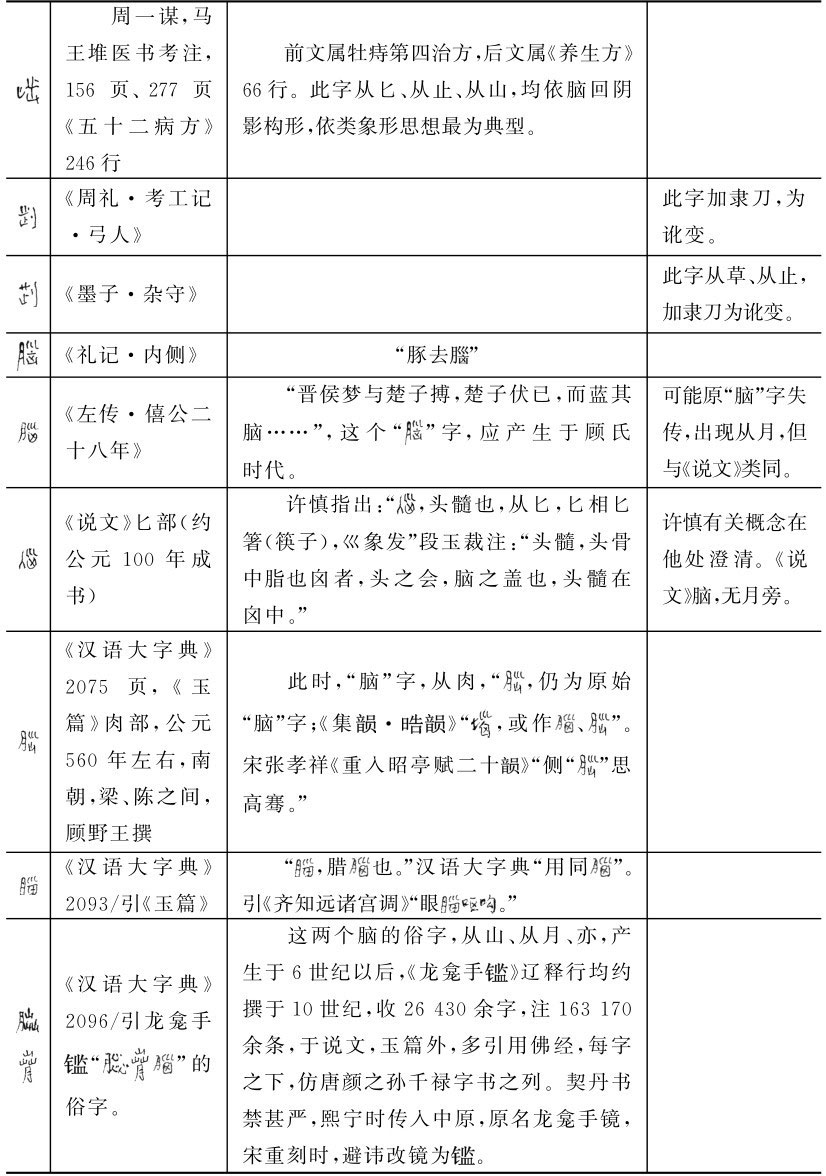 ”字从反人的本意,与未经后人修饰的《养生方》中的“脑”字从匕意义不同了。而且许慎本人未见过人脑表面的形态特征,未弄清造字者们创作“脑”字初文的认识过程。因而在“脑”字面前存在内心矛盾。战国时期的脑字“从匕”是取脑组织表面形态之象无疑。我搜集到不同时期的23个脑字,从匕、从山、从上、从止者占15个,其中两个讹变为土,说明后世的许多文字工作者都尊重“脑”组织表面形态特征。从史料看先秦到两汉时期的“脑”字也有从肉的,如《左传·僖公二十八年》(公元前632年)“楚子伏已,而盐其脑”。长沙马王堆出土的竹简《十问》有两个“脑”字作