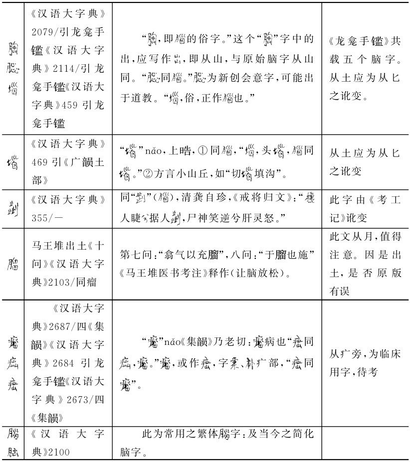 ”,亦从肉,这些史料有待进一步探讨。古辞书的脑字从肉,始见于南朝梁陈之间的顾野王撰著的《玉篇》,从总体上讲说明“脑”字规范为从肉是较晚的。