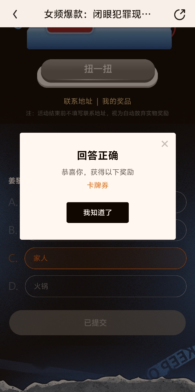 新活动答题可以领卡牌卷! 过去似乎答题是没有奖励的,最近新增的奖励。 答案选C,家人。 别忘了领取!