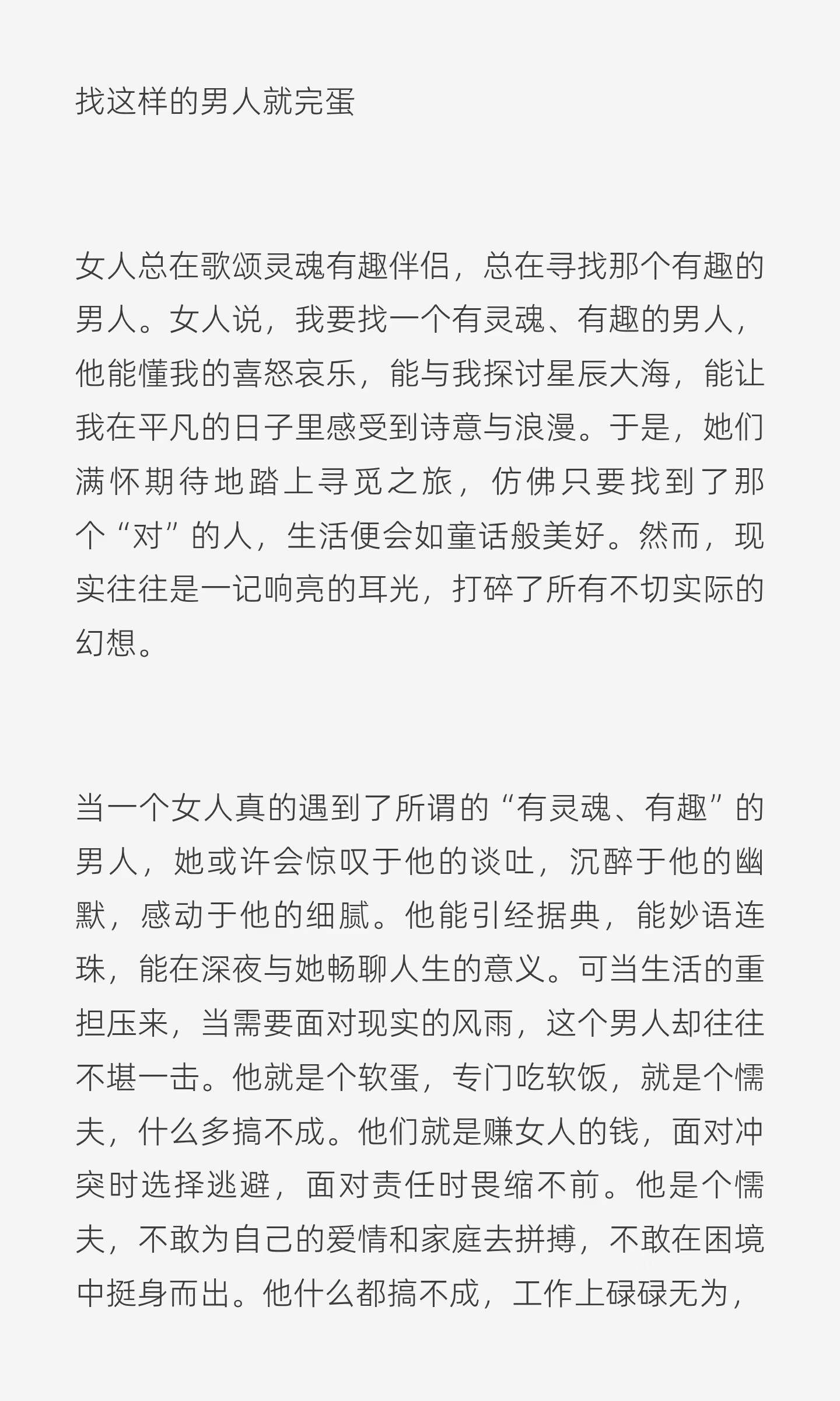 找有趣的男人你就完蛋,第一他是个懦夫,第二什么都干不成,第三他是个软蛋。第四他是个小人,他是靠女人吃饭,他是赚女人的钱。这种吃软饭,他把你哄得很开心,这种男人上不了战场,说难听点也活不了5秒。