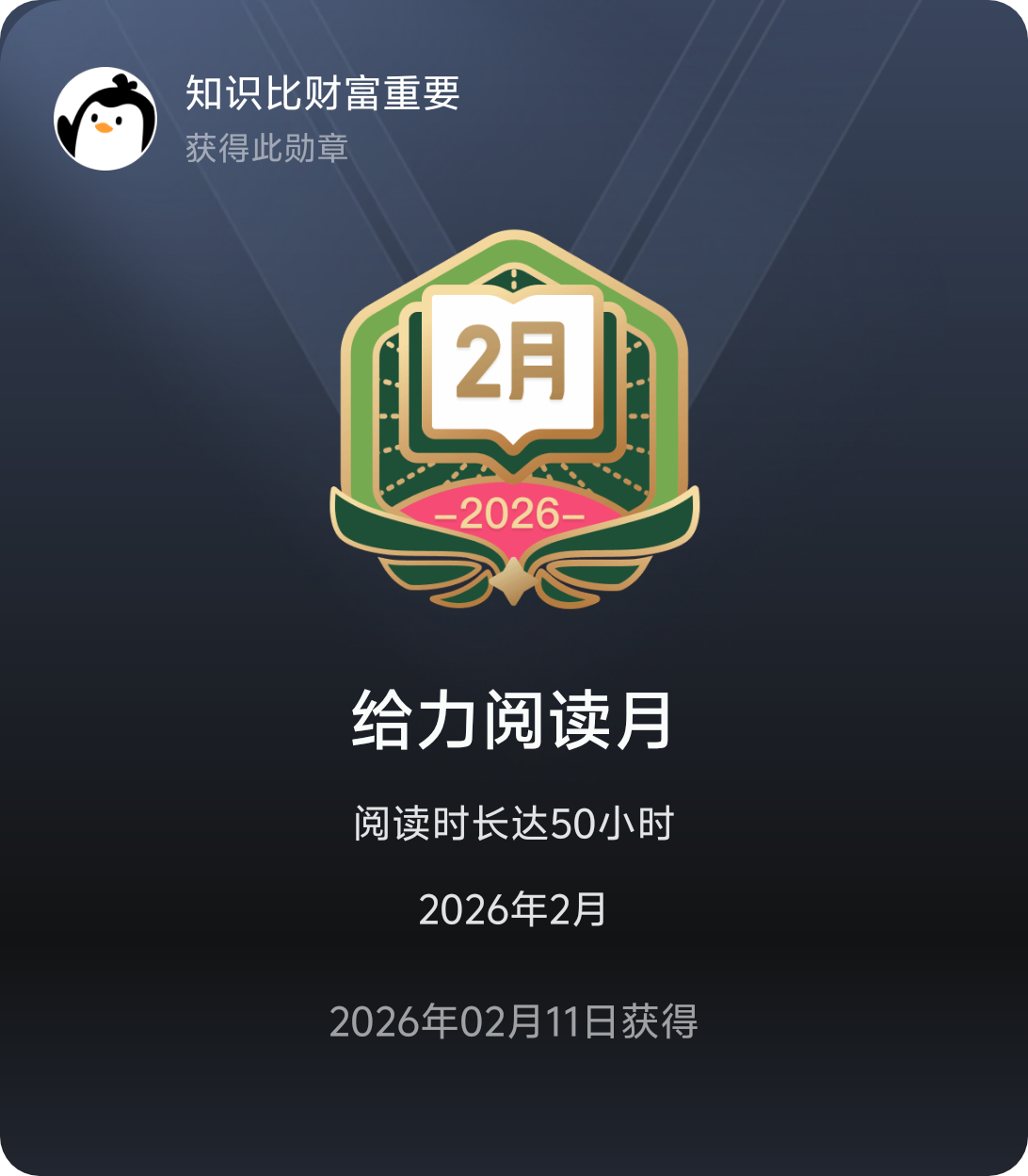 啦啦啦,勋章到手啦。 也算是良心活动了,刷刷阅读时长就能拿到。