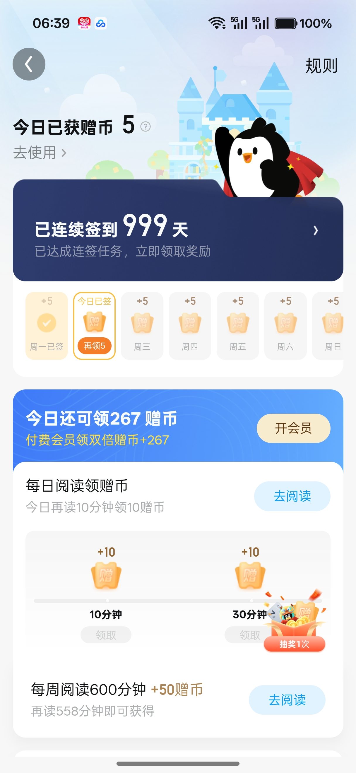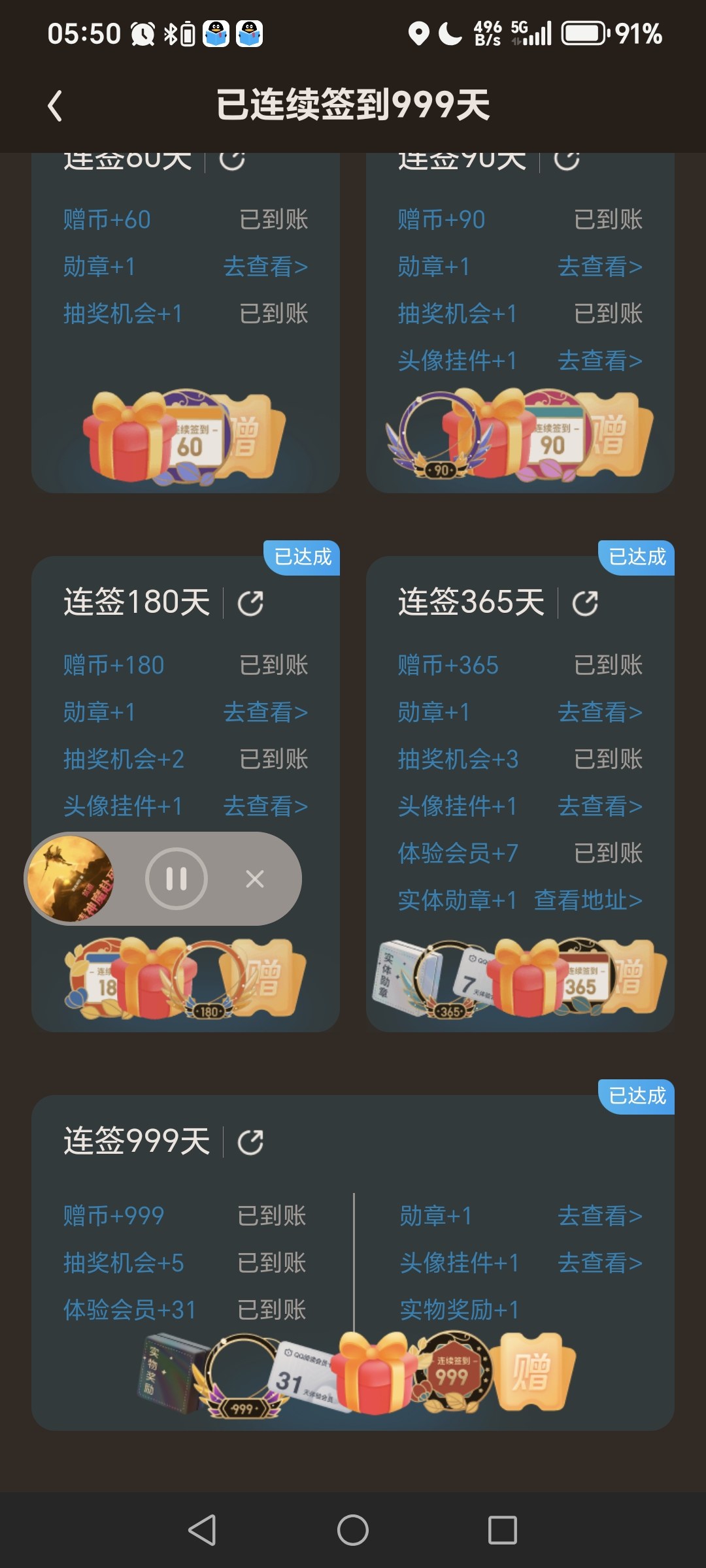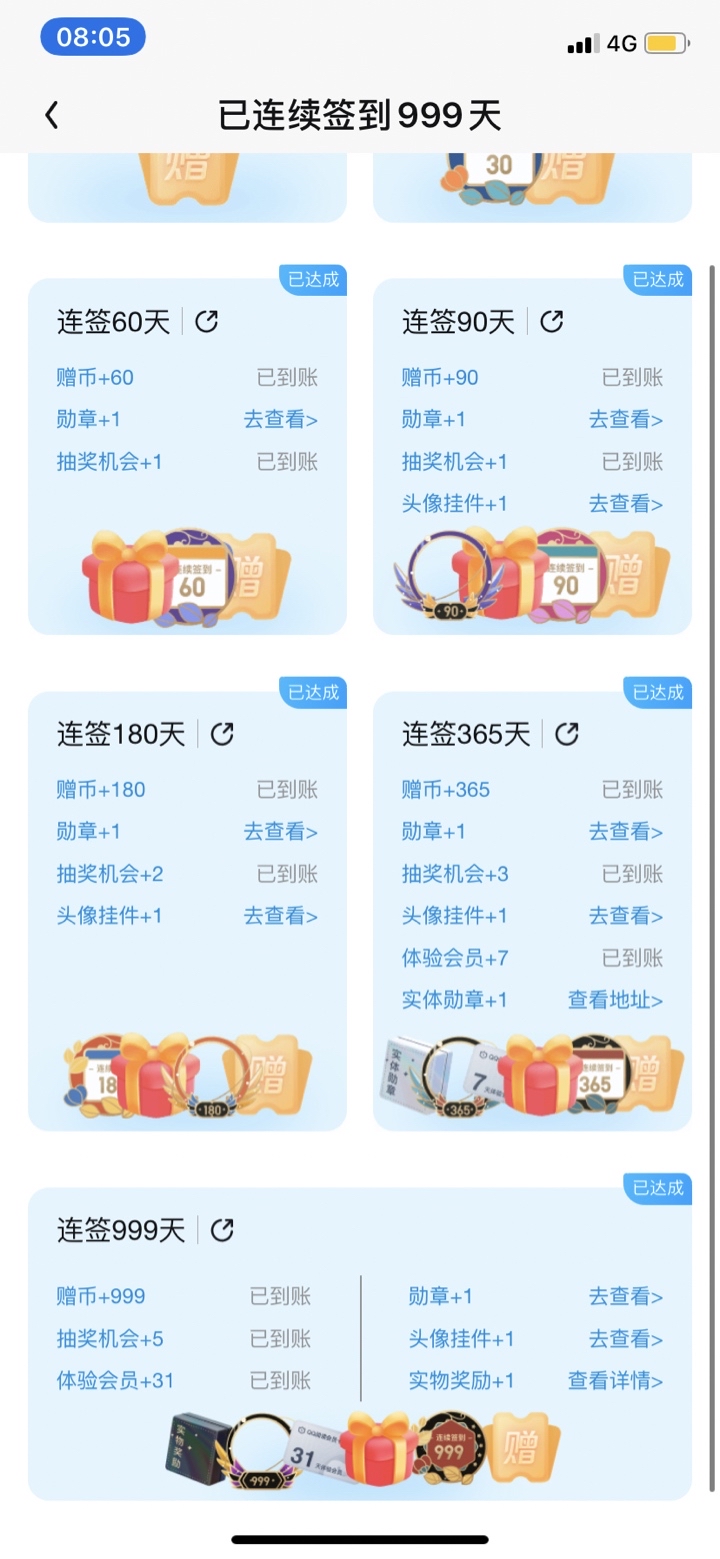 顺利达成999天连续签到!送了999赠币,还有一个月体验会员,还有五次抽奖机会,最期待的就是实物奖励了,不知会是什么