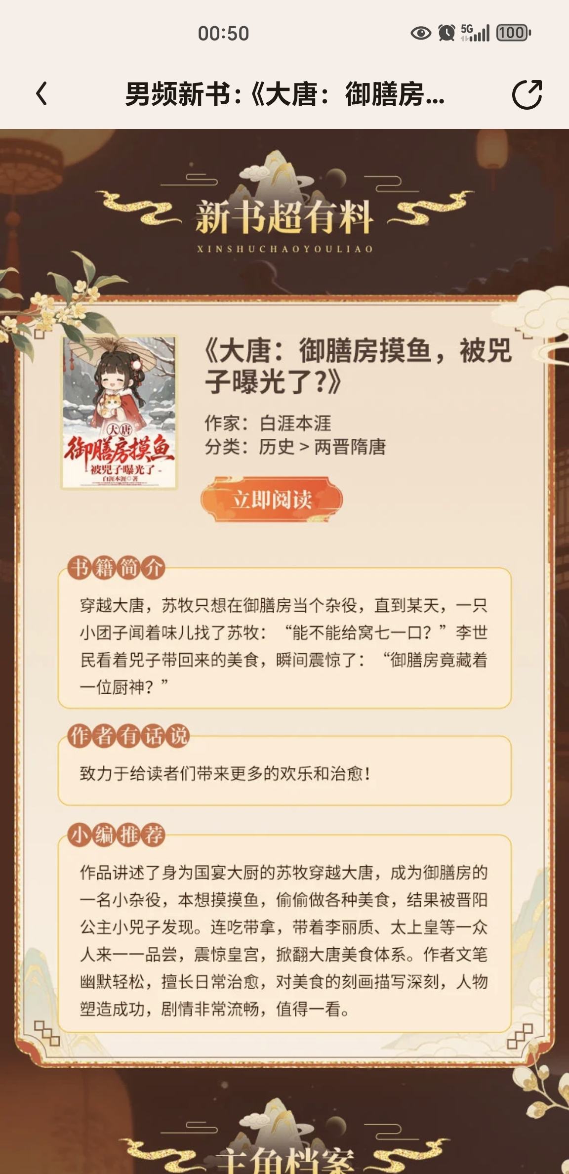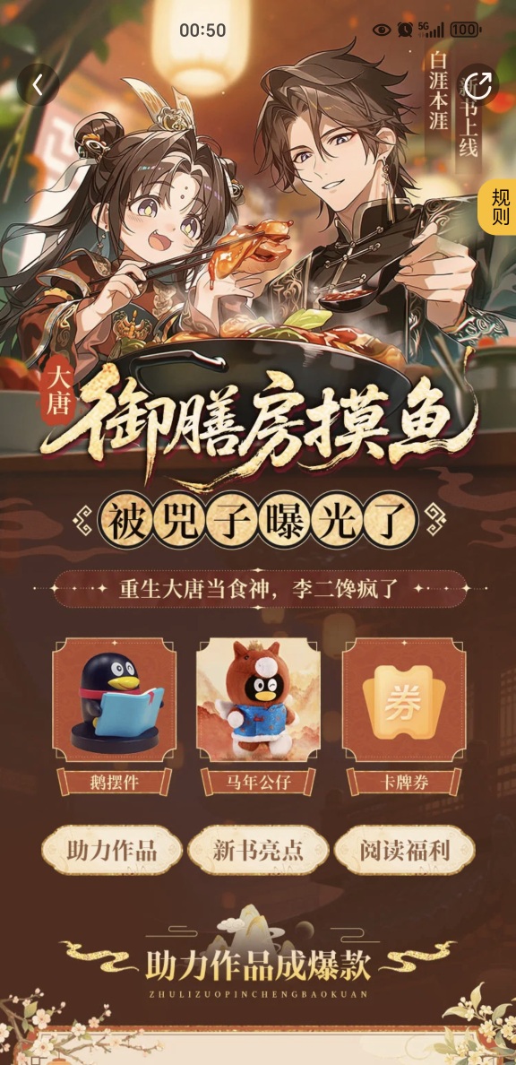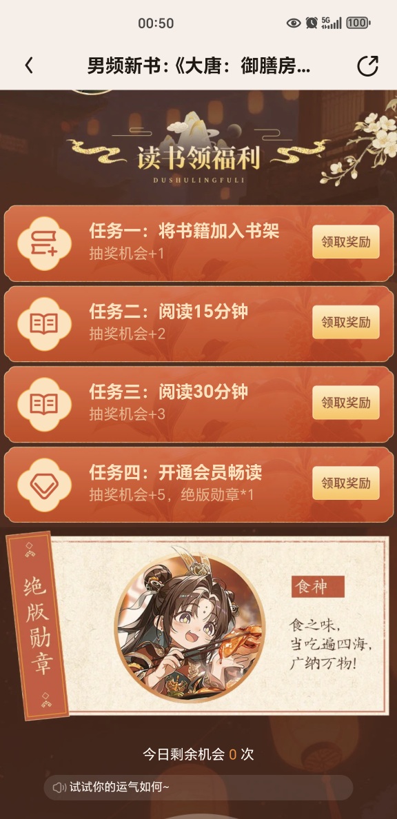 《大唐:御膳房摸鱼》新书写到馋人!加书架、读个十几分钟,抽奖机会哗哗涨,开会员还能抱走“食神”绝版勋章——这波边看边薅的福利,可别错过咯。