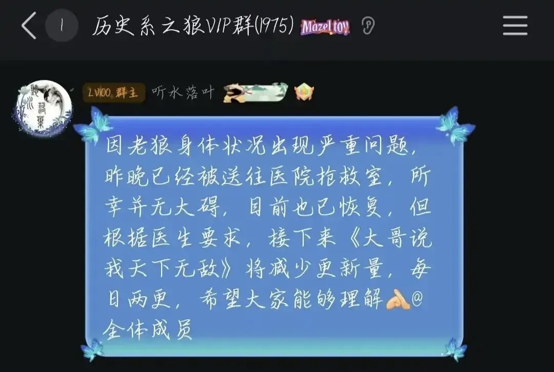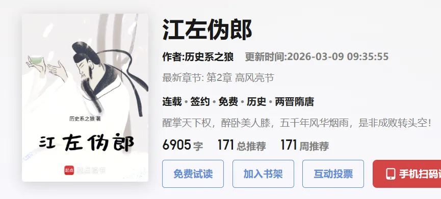 ICU中惊坐起,网文作者看谁卷! 先说几条简讯。 历史系之狼开了新书《江左伪郎》,晋代历史文。 上本书《大哥说我天下无敌》可能要仓促完结。不是哥们,说好的进ICU人差点没了,要放慢更新速度呢。 马不停蹄开新书,一点不带休息啊。