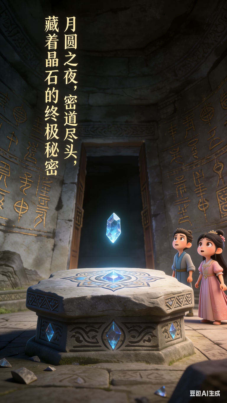 密道尽头,巨大的地下密室映入眼帘,密室中央的石台刻着晶石图案,石台上悬浮着一枚闪烁蓝光的晶石碎片;两人站在密室入口,一脸震撼 。