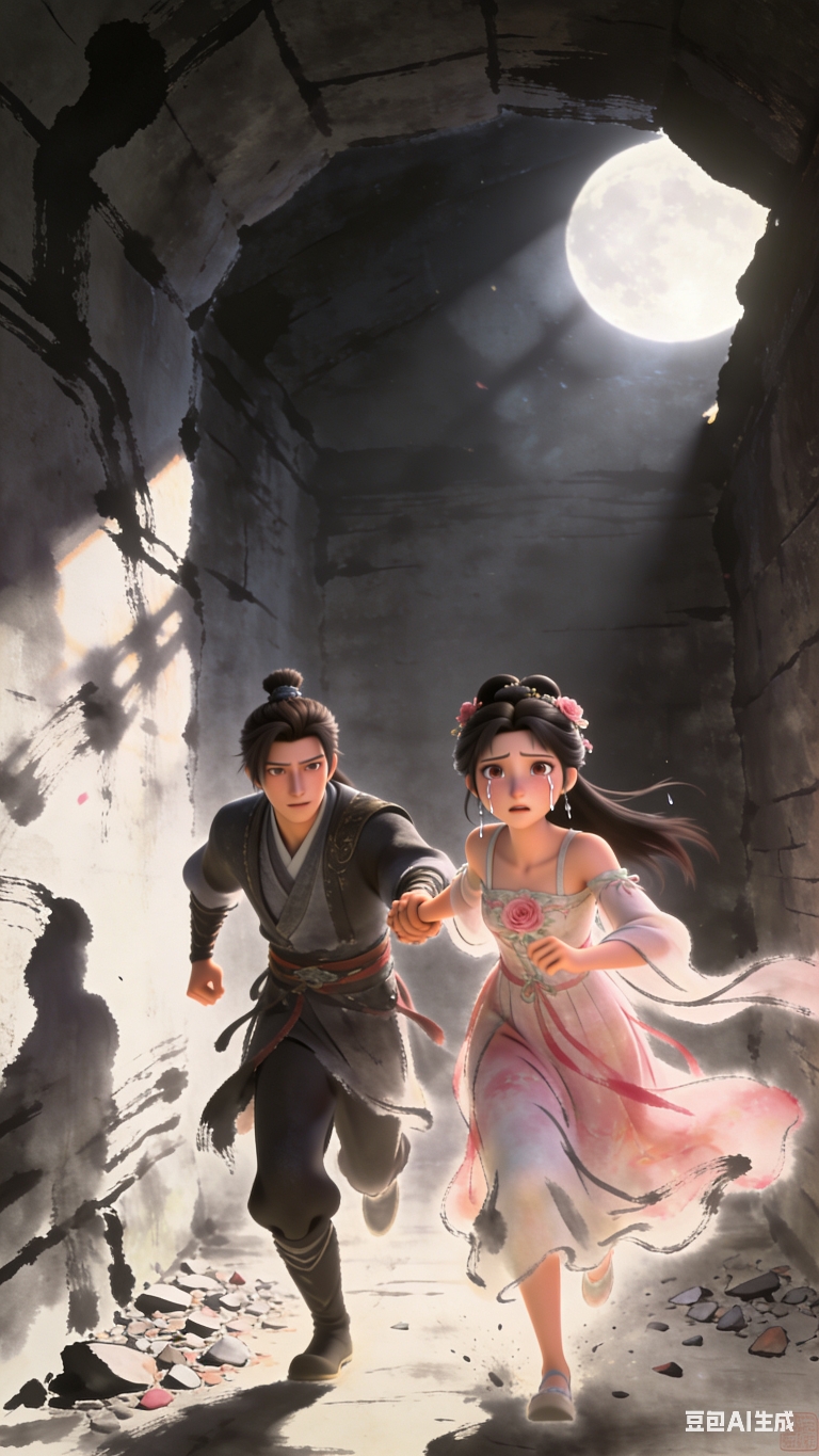 密道内,月光透过缝隙洒下斑驳光影,曹珏拉着蔷薇公主狂奔;少女的裙摆扫过地面的碎石,眼泪滑落脸颊,却依旧紧紧跟着曹珏 。