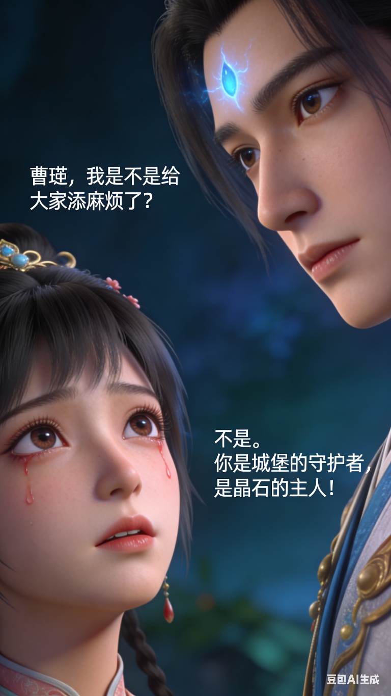 蔷薇公主停下脚步抬头看向曹珏,眼眶泛红,语气带着自责却坚定;曹珏回头,看着少女眉心的蓝光印记,摇了摇头 。