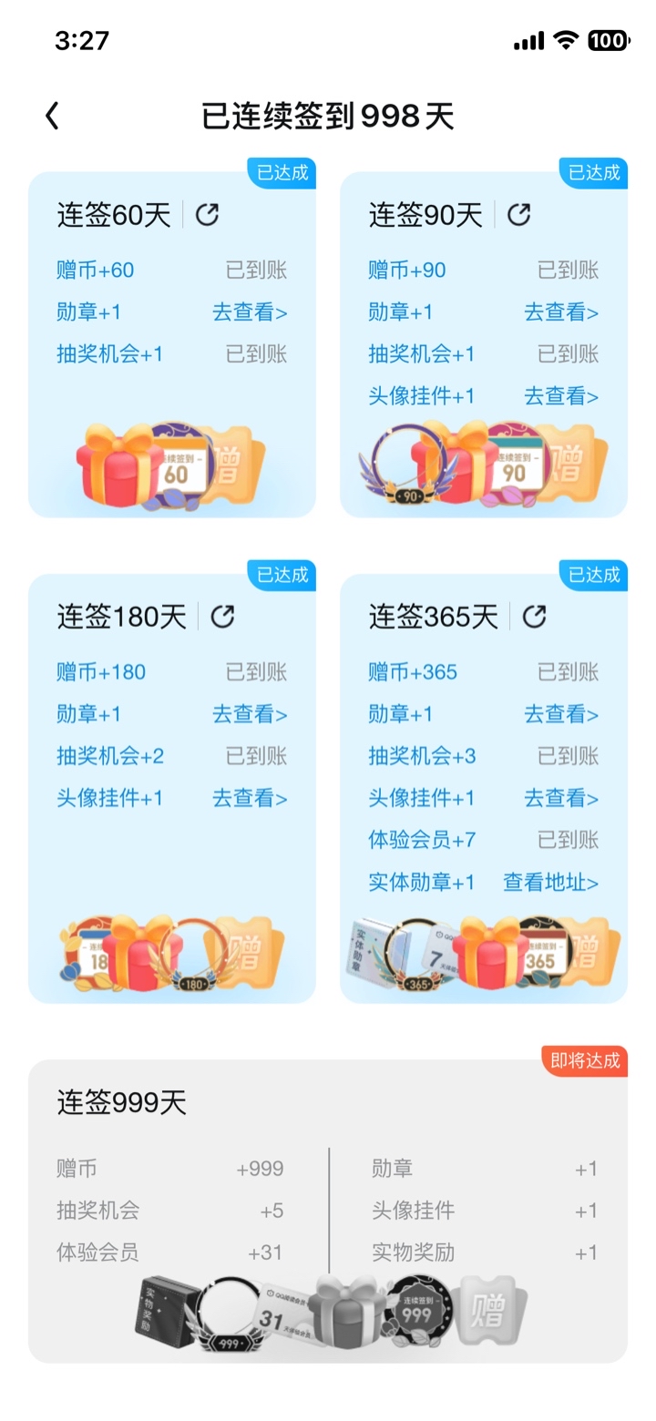 书友们有谁已经拥有连续签到999天的实物奖励了吗?请说一下是什么?蛮期待的!