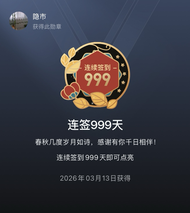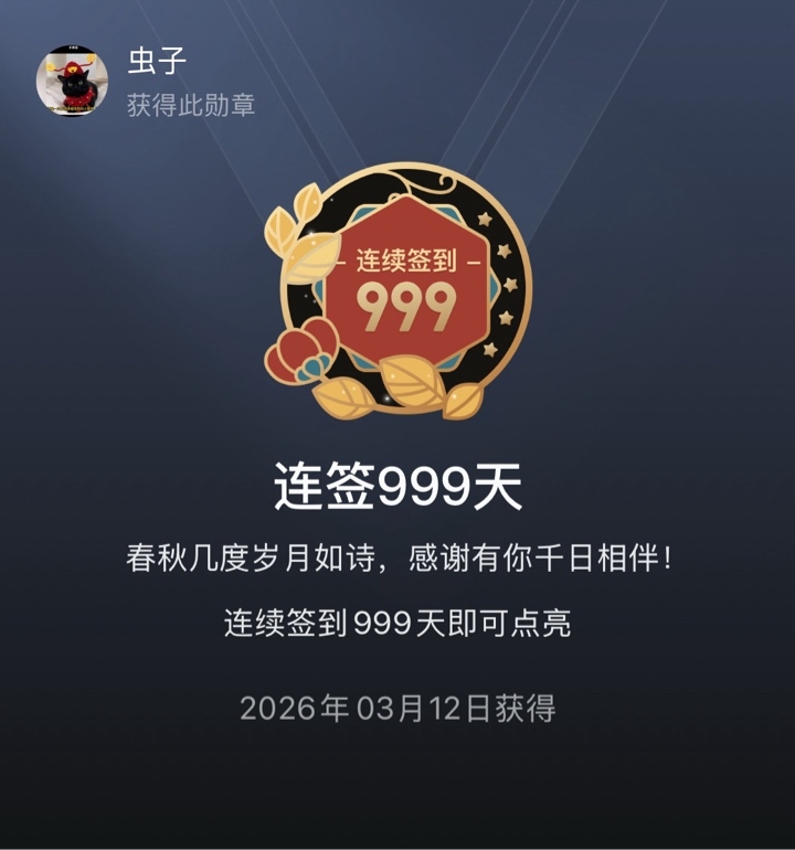 很高兴啊!勋章到手啦!999个日夜哦