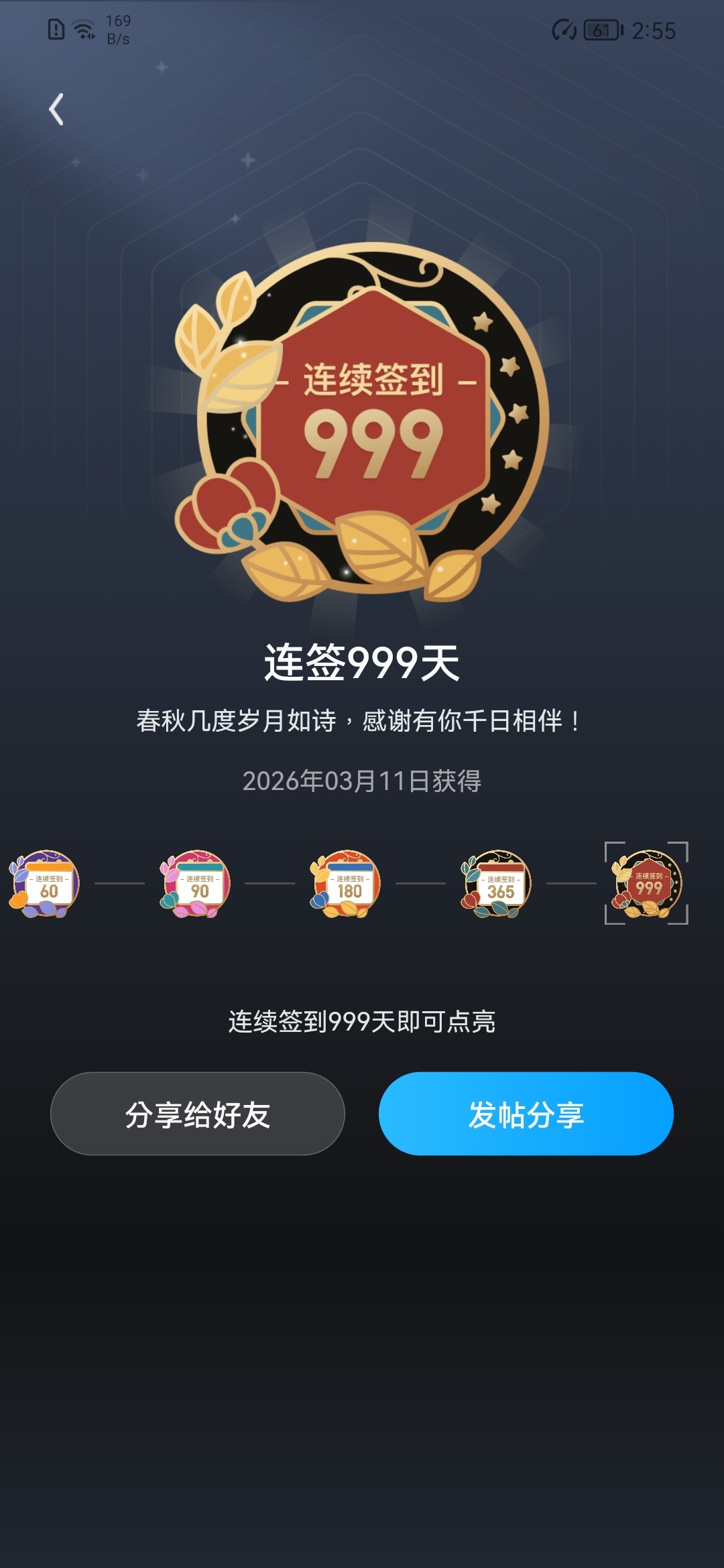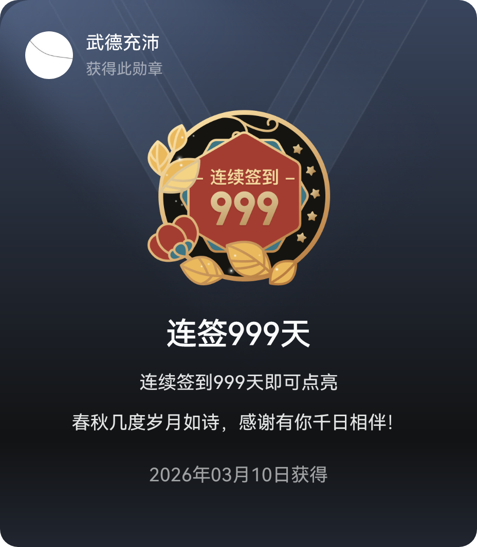 999天连续签到达成,最快的应该就是这一天吧。没有更早的了吧