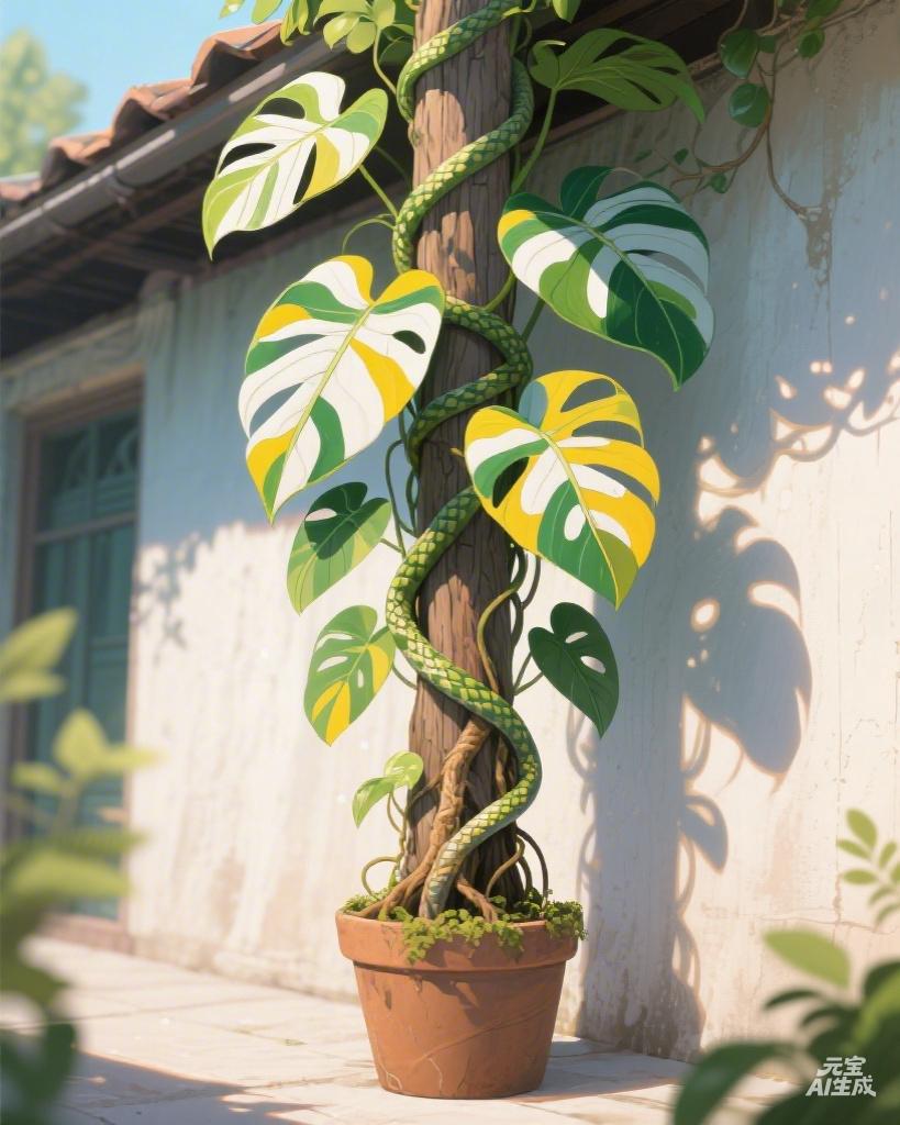 若是将这盆锦画龟背竹种在室外的墙边,很快便能够铺满墙面并一路攀越上房顶。