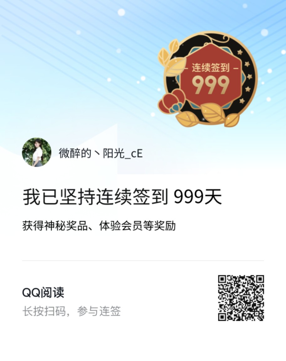 噔噔噔,坚持了999天,终于在今天的清晨,忍不住点了最后一次的签到,看到新鲜出炉的勋章,满怀感恩,感谢自己的坚持!看到30天会员自己启动,啧~,点早了,应该下午或傍晚再点,最起码会员到期那天还有一个上午或大多天好看会员书,哈哈哈!