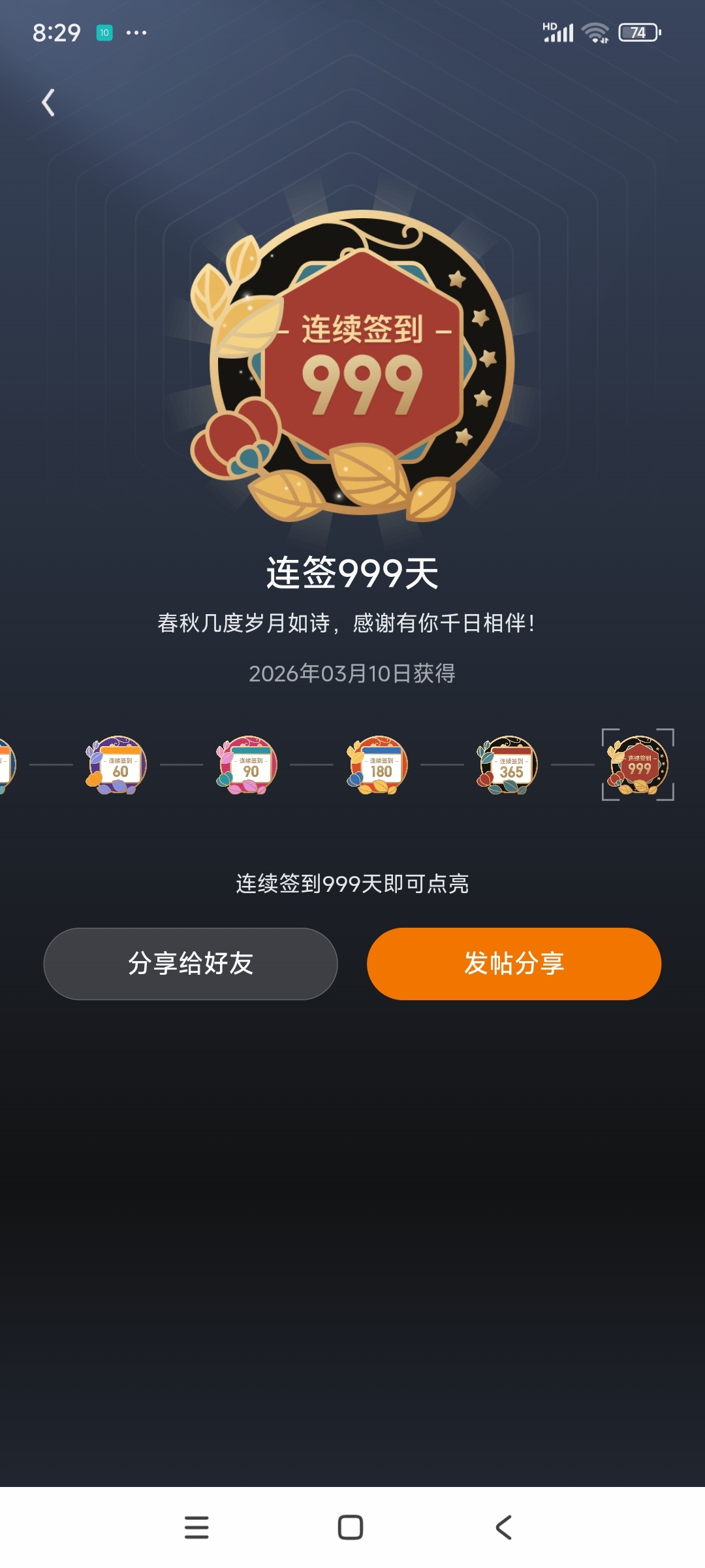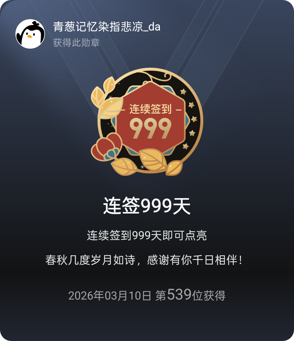 999天签到完成,有实物奖赏,没说是什么东西。大概是999立牌!!!