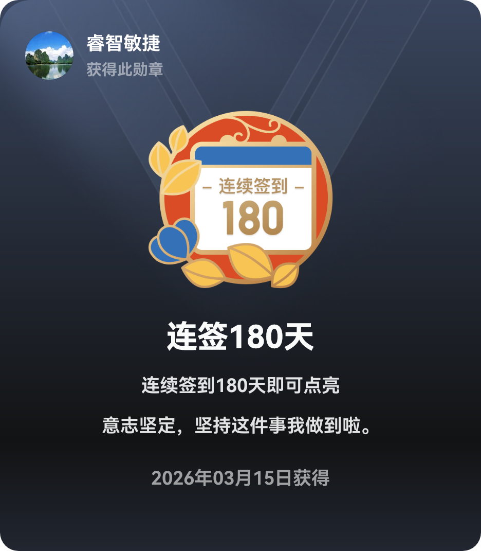 经历了两次断签,这次终于获得了这个勋章,真的很不容易! 别人21天就获得,我是需要一个多月,真服了!断一次都不行!
