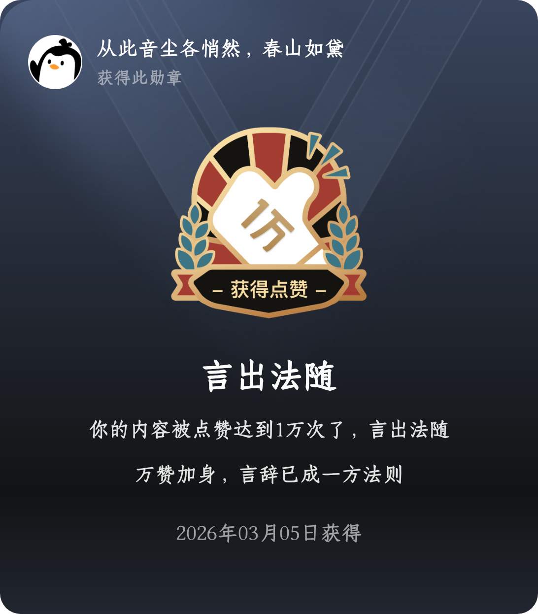 嘿嘿,今天必须得秀一下我的勋章!刚刚瞅见我在QQ阅读发的那个评论帖子,点赞数居然破万了,整整一万个!妈呀,这也太惊喜了吧,手都有点抖了哈哈。 真的谢谢大家这么捧场,平时就爱在QQ阅读上唠唠读后感,没想到能有这么多人认同。感觉像中了彩票似的,心里美滋滋的。生活里这种小确幸最治愈了——忙完一天,翻翻书、点点赞,突然来个好消息,整个人都亮堂了。马年开年就这么给力,看来今年要多攒点好书分享才行。以后我继续唠我的,大家随时来聊天哈,一起在阅读里找点乐子! 😄