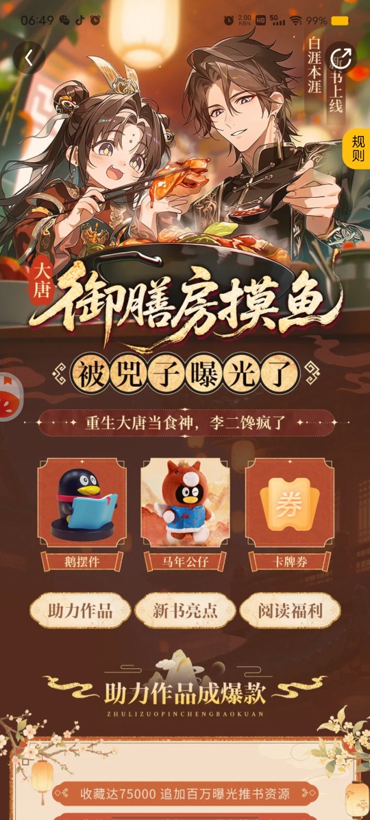 还是老规矩啊,要开会员领勋章 简介:【大唐+美食+萌娃+轻松搞笑+迪化流】 穿越大唐,苏牧只想在御膳房当个劈柴的低调杂役,毕竟前世做国宴主厨太累了。 谁知绑定“食神系统”,只要在工作时间偷偷给自己做美食,就能获得神级奖励! 于是,苏牧躲在角落里涮火锅、烤羊肉串、做奶茶…… 直到某天,一只粉雕玉琢的小团子闻着味儿找来了。 兕子:“锅锅,尼在七什么呀?能不能给窝七一口?” 苏牧无奈,只能开启投喂模式。 结果小兕子吃完还要打包! 李世民看着兕子带回来的“神仙美食”,瞬间震惊了:“这绝非凡间之味!御膳房竟藏着一位厨神?快给朕找出来!” 苏牧:“别找了,我真的只会劈柴啊!” 小兕子:“嘻嘻!锅锅,系子还要吃!” 李丽质:“我的天,人间竟然还有此等美味?”