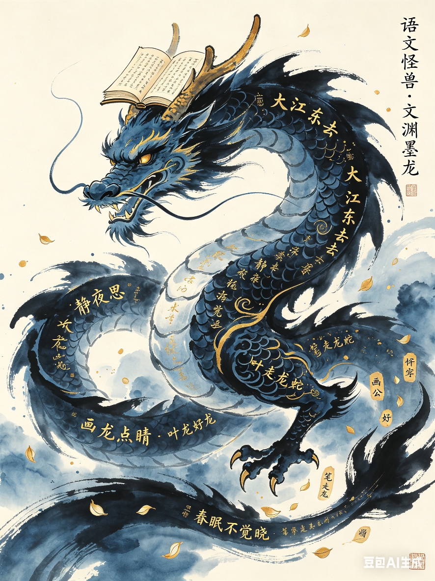 外貌:浑身缠绕水墨纹路,鳞片是古诗词字句,龙角顶着书卷,尾巴扫过会落下成语花瓣