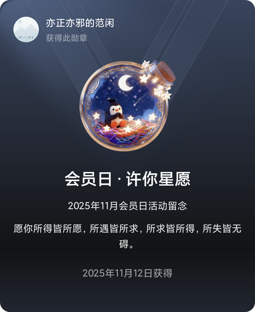 男频书新活动,依然是开会员得勋章。 后面我去看了看我的会员,发现付费会员和体验会员有效期都到2030年了,现在是2025年,五年的会员啊, 想要勋章,就要继续开会员,开了会员,后续又有无穷的书籍勋章收集活动,又要付钱,无穷无尽,一发不可收。 小Q,少来点付费勋章吧