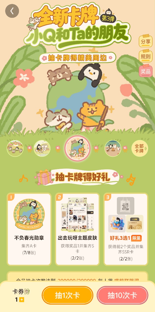 小Q活动,终于出货一次了。 过去都攒够10连,就抽,这次特意等了一天,多领了一张,还真出货了,离谱。 之前抽到的卡牌一直重复,除了开头的,很长时间都是缺一张A卡、一张S卡、一张SSR卡,之后一直都没有新卡。 好像许多人都已经集齐了呀。