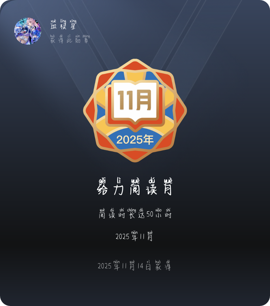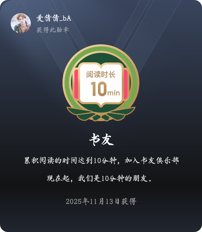 好消息!我得了个新勋章!还是十一月份的时长勋章,很意外,说明平时没少看 坏消息…我是小号啊…… 虽然新勋章有成就感,但是我更希望是另一个号上的,可能多少还是有点强迫症的,希望一个号上能尽善尽美(but花钱的我可不干)~ 不过,要是能把等级升上去,也是号尽其用了,鼓掌👏👏👏