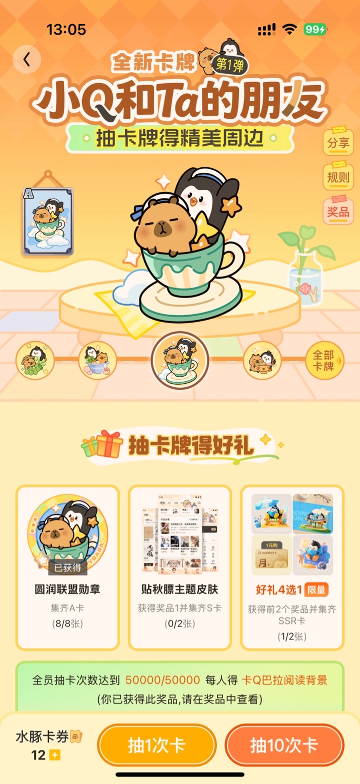 这套卡真的感觉实在太难抽了,到现在才堪堪集齐A卡,S卡我连影子都没看到,基本不指望能拿到主题了,每次活动虚拟奖品都是扣扣搜搜的![[表情]](https://iyuedu.reader.qq.com/image/emoji/Emoj_17.png)
