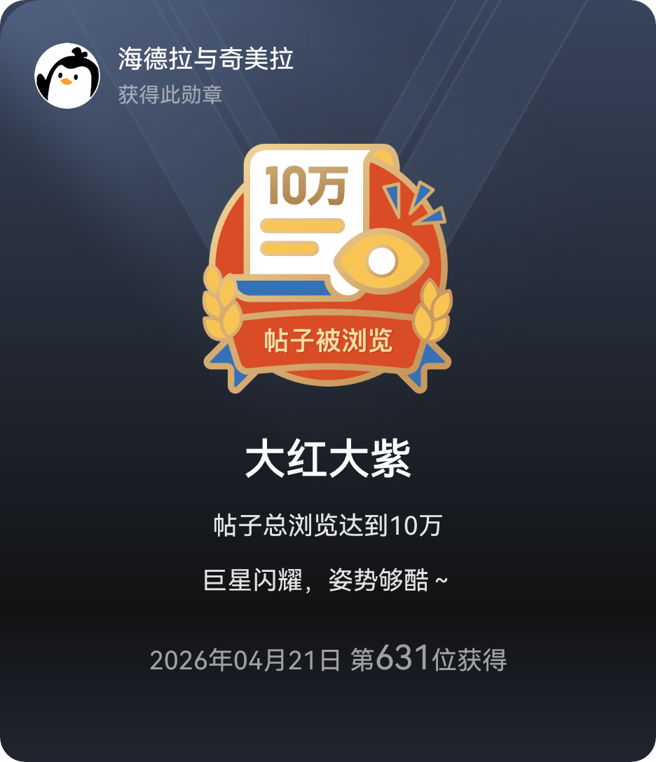 今天得到了一个新的勋章,我是第631位得到这个勋章,贴子10万浏览量,,看来说书人计划没什么人参加,我大概参加了3,4个月吧,我都没有注意